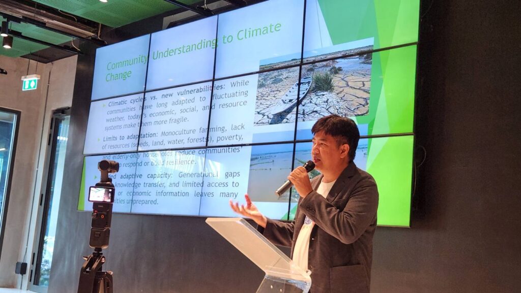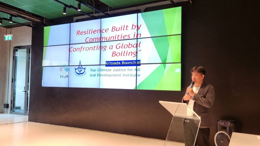 กฤษฎา บุญชัย เลขาธิการสถาบันชุมชนท้องถิ่นพัฒนา และผู้ประสานงาน Thai Climate Justice for All ในฐานะผู้บรรยายหลัก ได้นำเสนอว่า การปรับตัวของชุมชนต้องเริ่มจากการทำความเข้าใจ คุณค่าทางวัฒนธรรมและความสัมพันธ์ลึกซึ้งระหว่างชุมชนกับธรรมชาติ ไม่ใช่การผลักดันแบบ top-down ที่ละเลยมิติชีวิตจริงของผู้คน เพราะผลกระทบจากการเปลี่ยนแปลงสภาพภูมิอากาศไม่ได้กระทบเพียงกายภาพหรือเศรษฐกิจ แต่ยังลึกถึงอัตลักษณ์และความเปราะบางเชิงโครงสร้าง การส่งเสริมการปรับตัวจึงควรเป็นการสร้างพลังให้สิทธิทางวัฒนธรรมและนิเวศของชุมชนเข้มแข็งขึ้น ซึ่งถือเป็นทั้งสิทธิมนุษยชนและแก่นของความเป็นธรรมทางสภาพภูมิอากาศ