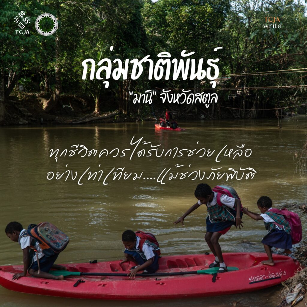 กรณีกลุ่มชาติพันธ์ุ “มานิ” จังหวัดสตูล โดยการใช้ชีวิตของพวกเขาอยู่รอดด้วยการพึ่งพาป่า เกือบ 100 เปอร์เซ็นต์ เมื่อเกิดวิกฤตน้ำท่วมป่า ทำให้พวกเขาไม่สามารถหาอาหารกินเองได้ เส้นทางการสัญจรเพื่อที่จะเข้าไปหาอาหารในเมืองก็ไม่สามารถสัญจรได้ เดิมเส้นทางที่มีสะพาน ที่ใช้สำหรับสัญจรเพื่อดำเนินชีวิตทั่วไป สำหรับเด็ก ๆ กลุ่มชาติพันธ์ุ “มานิ” แล้ว พวกเขาใช้เป็นสะพานเป็นเส้นทางข้ามไปอีกฝั่งเพื่อไปโรงเรียน