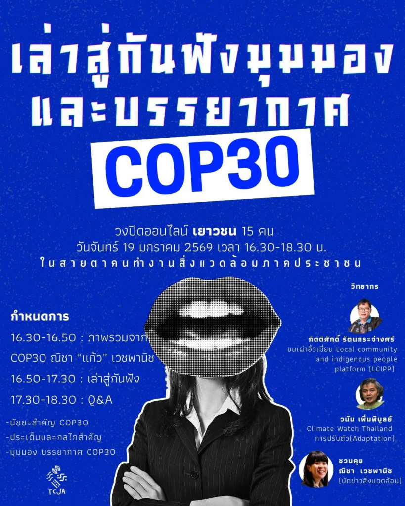 วงคุยครั้งนี้เป็นวงปิดเล็กๆ ของคนทำงานสิ่งแวดล้อม นักข่าว นักกิจกรรม เยาวชน และคนทำงานกับชุมชนที่ได้มีโอกาสไปร่วมงาน COP30 ที่เมืองเบเลง ประเทศบราซิล รวมทั้งคนที่ติดตามอยู่ห่างๆ จุดประสงค์คือแลกเปลี่ยนประสบการณ์ บรรยากาศ และความรู้สึกต่อเวทีเจรจาโลกร้อน ทั้งในพื้นที่การประชุมหลักของสหประชาชาติ และในเวทีภาคประชาชนหรือ People’s Summit